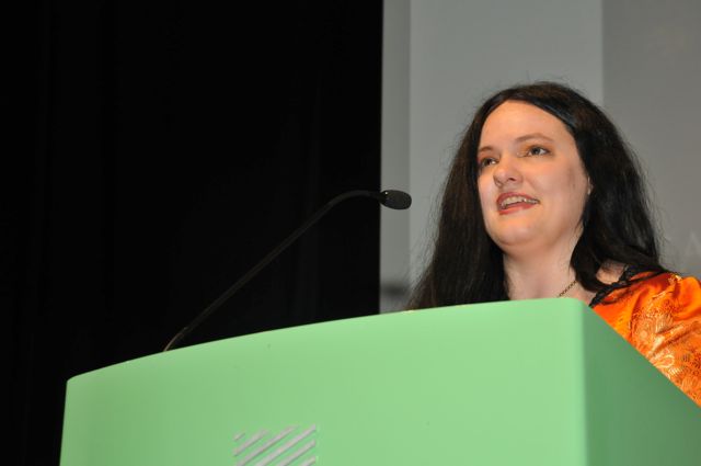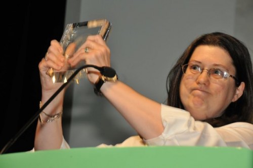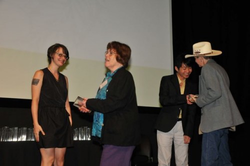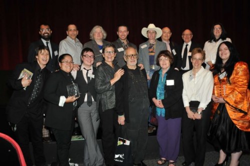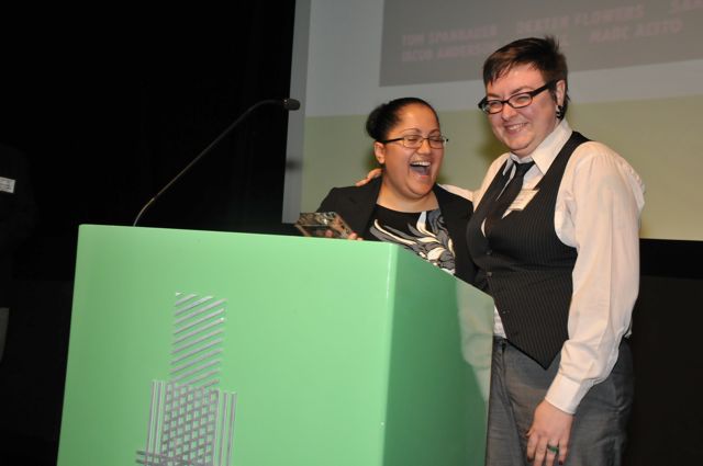 Sacchi Green and Rakelle Valencia accept Lambda Award for Lesbian Erotica for 'Lesbian Cowboys' from volunteers Courtney Gillette and Wei Hao KaoGabrielle Rivera and Christa Orth accept the Lambda Award for 'Portland Queer'