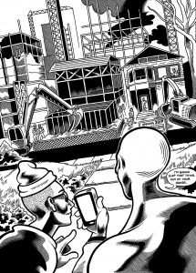 His brilliant earlier works, Hungry Bottom Comics and Babybel Wax Bodysuit, caught my attention, and I was excited that this most recent book tackled something many of us are experiencing—the cultural homogenization of cities–with verve, queerness, and psychedelic panache. Eric was in the midst of traveling to comic book conventions and conferences this spring, but he graciously agreed to do this interview via email.